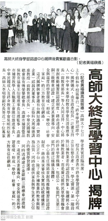 台灣好報:高師大終身學習認證中心揭牌 將打造補教界金銀銅質獎章