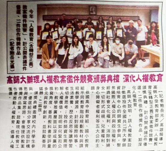 民時新聞報:高師大辦理人權教案徵件競賽頒獎典禮 深化人權教育【報紙版如附檔】