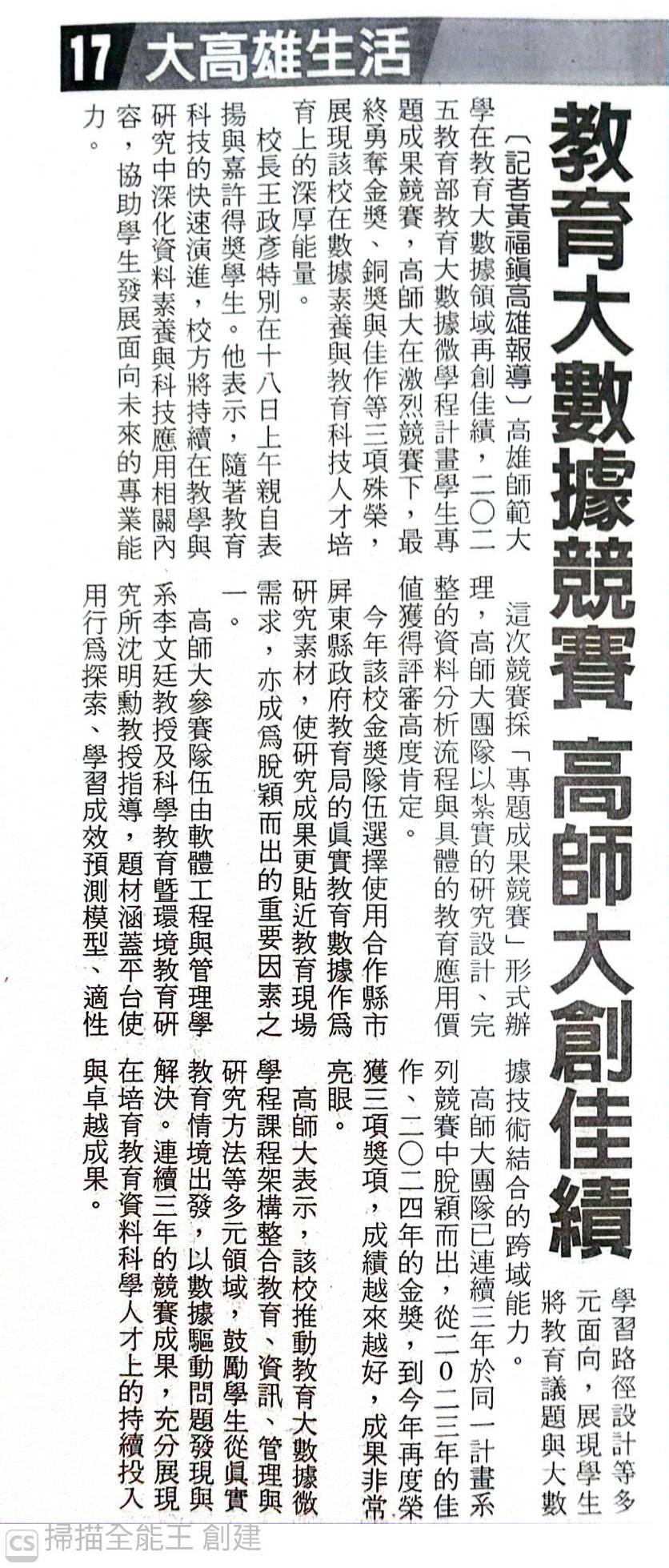 台灣新生報:高師大2025教育大數據勇奪金獎、銅獎與佳作 連三年獲獎【報紙版如附檔】